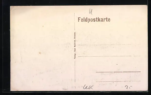 Personenbezogene Daten auf der Rückseite der Karte wurden durch blauen Textmarker unkenntlich gemacht. Die blauen Stellen sind auf die Vorderseite durchgeweicht und wirken sich negativ auf das Postkartenfoto aus