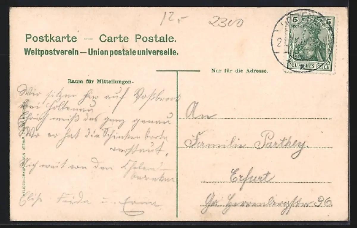 Personenbezogene Daten auf der Rückseite der Karte wurden durch blauen Textmarker unkenntlich gemacht. Die blauen Stellen sind auf die Vorderseite durchgeweicht und wirken sich negativ auf das Postkartenfoto aus