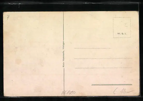 Personenbezogene Daten auf der Rückseite der Karte wurden durch blauen Textmarker unkenntlich gemacht. Die blauen Stellen sind auf die Vorderseite durchgeweicht und wirken sich negativ auf das Postkartenfoto aus