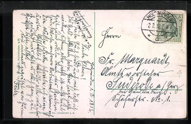Personenbezogene Daten auf der Rückseite der Karte wurden durch blauen Textmarker unkenntlich gemacht. Die blauen Stellen sind auf die Vorderseite durchgeweicht und wirken sich negativ auf das Postkartenfoto aus