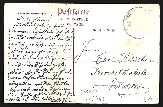 alte Ansichtskarte, gelaufen, Briefmarke entfernt, guter Zustand