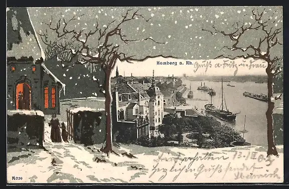 AK Homberg a. Rh., Ortsansicht mit Segelschiff
