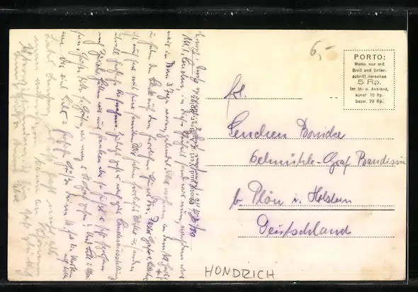 Personenbezogene Daten auf der Rückseite der Karte wurden durch blauen Textmarker unkenntlich gemacht. Die blauen Stellen sind auf die Vorderseite durchgeweicht und wirken sich negativ auf das Postkartenfoto aus