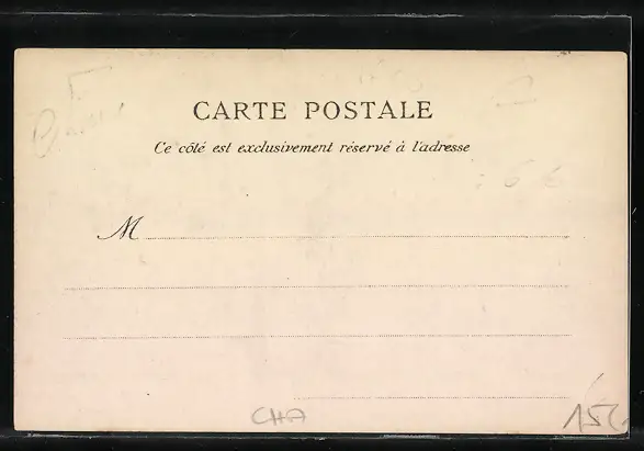 Personenbezogene Daten auf der Rückseite der Karte wurden durch blauen Textmarker unkenntlich gemacht. Die blauen Stellen sind auf die Vorderseite durchgeweicht und wirken sich negativ auf das Postkartenfoto aus