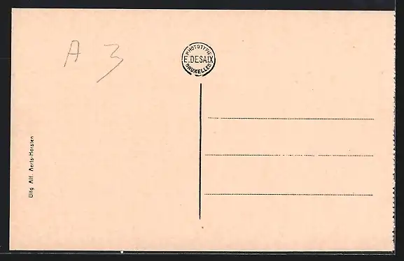 Personenbezogene Daten auf der Rückseite der Karte wurden durch blauen Textmarker unkenntlich gemacht. Die blauen Stellen sind auf die Vorderseite durchgeweicht und wirken sich negativ auf das Postkartenfoto aus