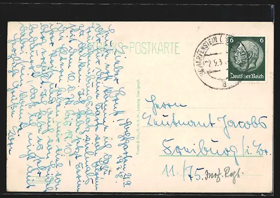 Personenbezogene Daten auf der Rückseite der Karte wurden durch blauen Textmarker unkenntlich gemacht. Die blauen Stellen sind auf die Vorderseite durchgeweicht und wirken sich negativ auf das Postkartenfoto aus