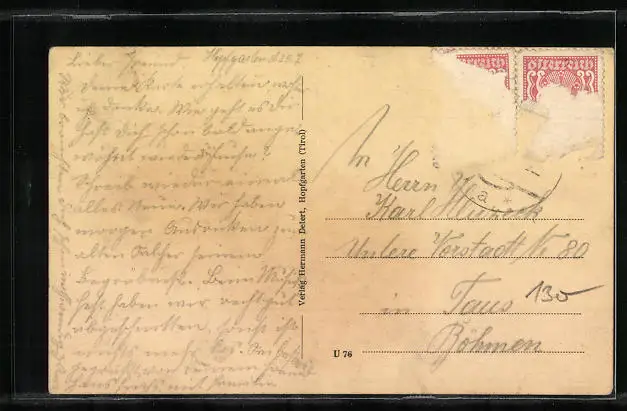alte Ansichtskarte, gelaufen, Briefmarke entfernt, rückseitig Oberflächenschaden, guter Zustand