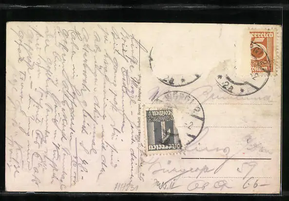 alte Ansichtskarte, gelaufen, Briefmarke entfernt, rückseitig Oberflächenschaden, Eckknicke rechts, guter Zustand