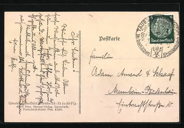 Personenbezogene Daten auf der Rückseite der Karte wurden durch blauen Textmarker unkenntlich gemacht. Die blauen Stellen sind auf die Vorderseite durchgeweicht und wirken sich negativ auf das Postkartenfoto aus