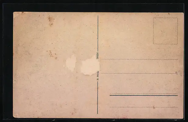 Personenbezogene Daten auf der Rückseite der Karte wurden durch blauen Textmarker unkenntlich gemacht. Die blauen Stellen sind auf die Vorderseite durchgeweicht und wirken sich negativ auf das Postkartenfoto aus