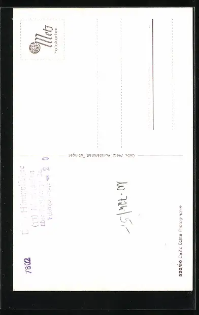Personenbezogene Daten auf der Rückseite der Karte wurden durch blauen Textmarker unkenntlich gemacht. Die blauen Stellen sind auf die Vorderseite durchgeweicht und wirken sich negativ auf das Postkartenfoto aus