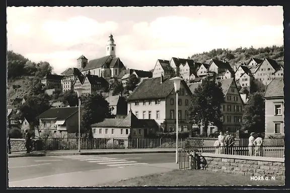 AK Horb a. N., Strassenpartie mit Kirche