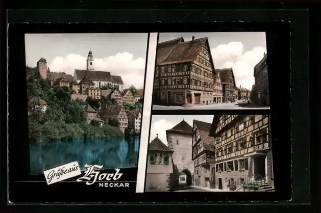 AK Horb am Neckar, alte Fachwerkhäuser, Blick zur Kirche