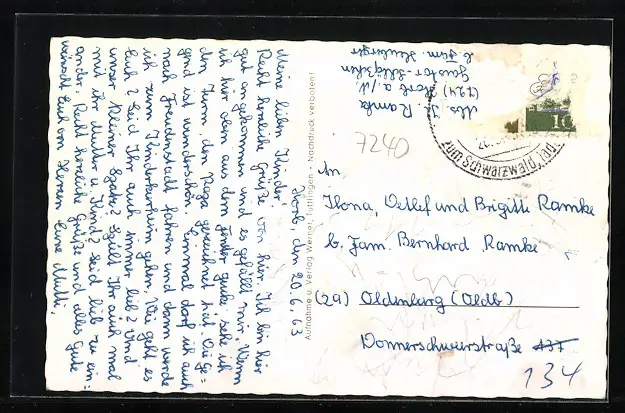 Personenbezogene Daten auf der Rückseite der Karte wurden durch blauen Textmarker unkenntlich gemacht. Die blauen Stellen sind auf die Vorderseite durchgeweicht und wirken sich negativ auf das Postkartenfoto aus