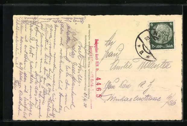 Personenbezogene Daten auf der Rückseite der Karte wurden durch blauen Textmarker unkenntlich gemacht. Die blauen Stellen sind auf die Vorderseite durchgeweicht und wirken sich negativ auf das Postkartenfoto aus
