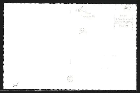 Personenbezogene Daten auf der Rückseite der Karte wurden durch blauen Textmarker unkenntlich gemacht. Die blauen Stellen sind auf die Vorderseite durchgeweicht und wirken sich negativ auf das Postkartenfoto aus