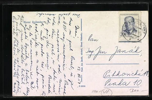 Personenbezogene Daten auf der Rückseite der Karte wurden durch blauen Textmarker unkenntlich gemacht. Die blauen Stellen sind auf die Vorderseite durchgeweicht und wirken sich negativ auf das Postkartenfoto aus