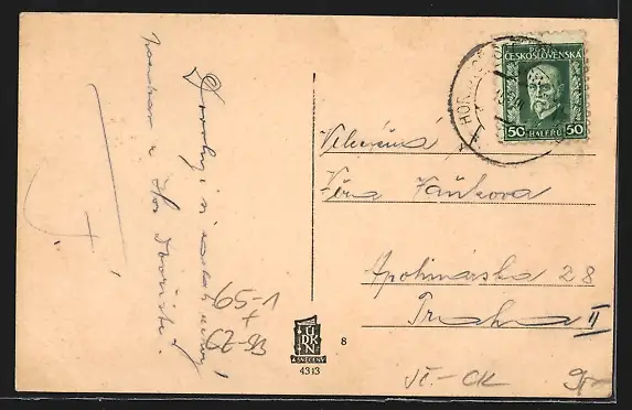 Personenbezogene Daten auf der Rückseite der Karte wurden durch blauen Textmarker unkenntlich gemacht. Die blauen Stellen sind auf die Vorderseite durchgeweicht und wirken sich negativ auf das Postkartenfoto aus
