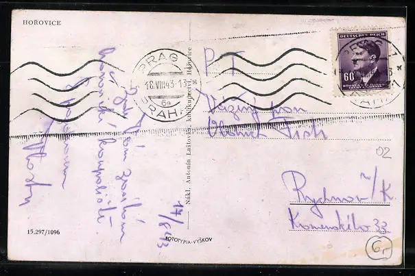 Personenbezogene Daten auf der Rückseite der Karte wurden durch blauen Textmarker unkenntlich gemacht. Die blauen Stellen sind auf die Vorderseite durchgeweicht und wirken sich negativ auf das Postkartenfoto aus