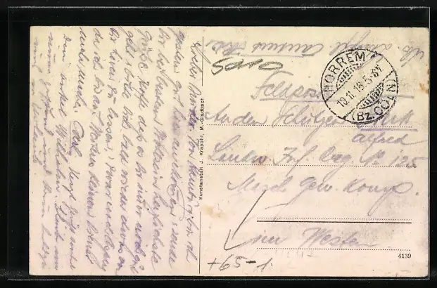Personenbezogene Daten auf der Rückseite der Karte wurden durch blauen Textmarker unkenntlich gemacht. Die blauen Stellen sind auf die Vorderseite durchgeweicht und wirken sich negativ auf das Postkartenfoto aus