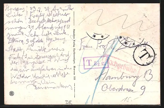 Personenbezogene Daten auf der Rückseite der Karte wurden durch blauen Textmarker unkenntlich gemacht. Die blauen Stellen sind auf die Vorderseite durchgeweicht und wirken sich negativ auf das Postkartenfoto aus
