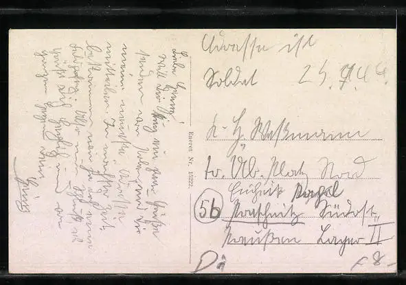 Personenbezogene Daten auf der Rückseite der Karte wurden durch blauen Textmarker unkenntlich gemacht. Die blauen Stellen sind auf die Vorderseite durchgeweicht und wirken sich negativ auf das Postkartenfoto aus