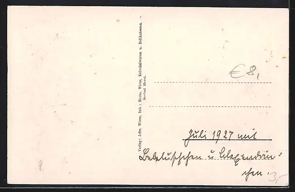 Personenbezogene Daten auf der Rückseite der Karte wurden durch blauen Textmarker unkenntlich gemacht. Die blauen Stellen sind auf die Vorderseite durchgeweicht und wirken sich negativ auf das Postkartenfoto aus