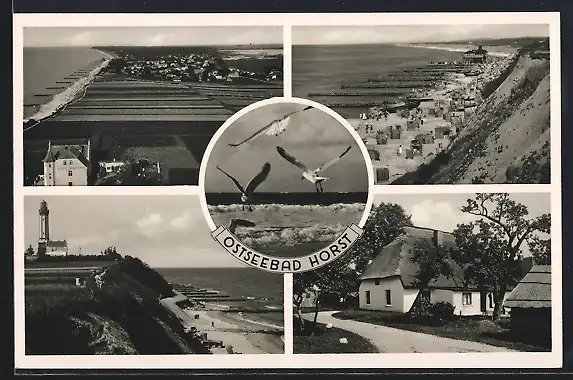 AK Horst, Strandpartie, Gebäudeansicht, Leuchtturm, Möwen