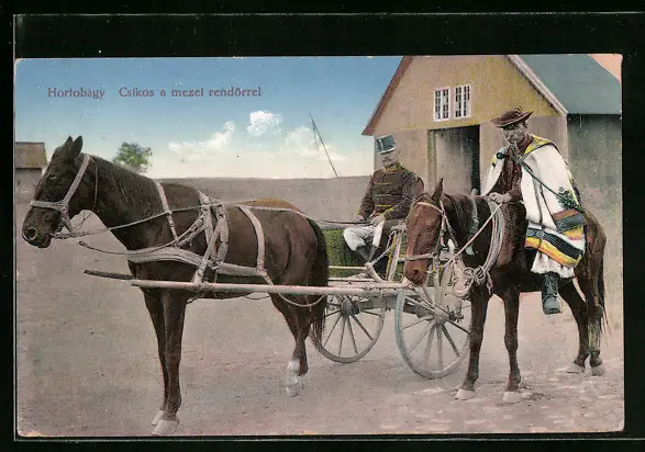 AK Hortobágy, Reiter in Tracht und ungarischer Soldat im Einspänner