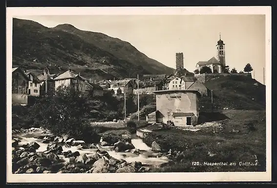 AK Hospenthal am Gotthard, Ortsansicht mit Kirche und altem Turm