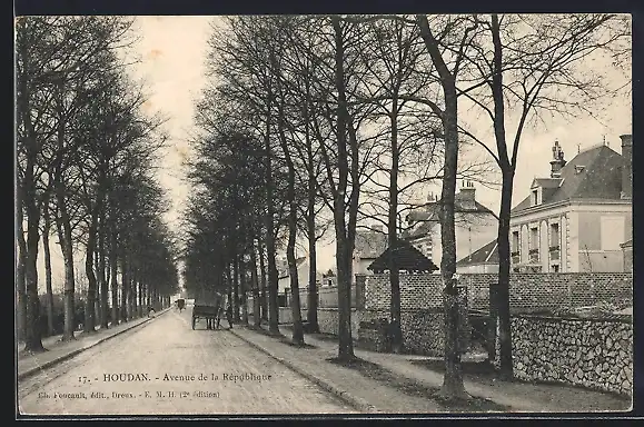 AK Houdan, Avenue de la République avec calèche et arbres alignés