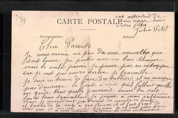 Personenbezogene Daten auf der Rückseite der Karte wurden durch blauen Textmarker unkenntlich gemacht. Die blauen Stellen sind auf die Vorderseite durchgeweicht und wirken sich negativ auf das Postkartenfoto aus