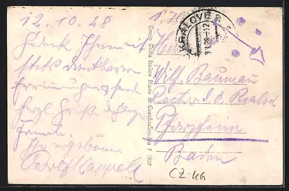 Personenbezogene Daten auf der Rückseite der Karte wurden durch blauen Textmarker unkenntlich gemacht. Die blauen Stellen sind auf die Vorderseite durchgeweicht und wirken sich negativ auf das Postkartenfoto aus