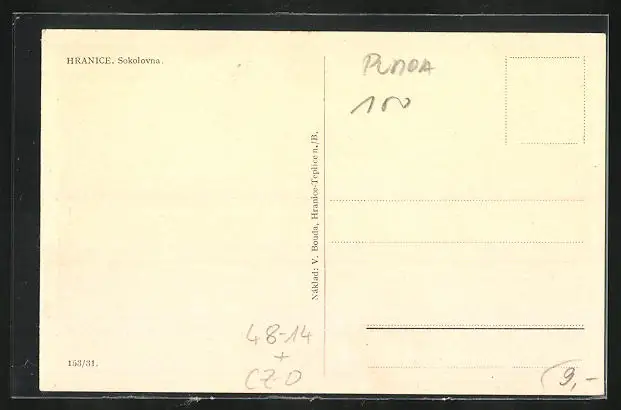 Personenbezogene Daten auf der Rückseite der Karte wurden durch blauen Textmarker unkenntlich gemacht. Die blauen Stellen sind auf die Vorderseite durchgeweicht und wirken sich negativ auf das Postkartenfoto aus