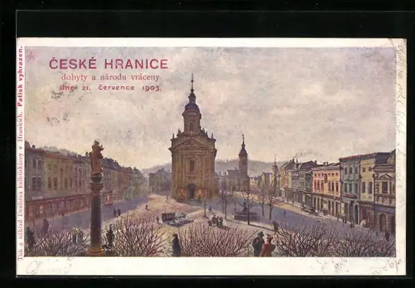 AK Hranice na Morave, Denkmal auf dem Hauptplatz, Blick zur Kirche