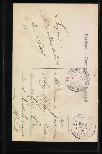 Personenbezogene Daten auf der Rückseite der Karte wurden durch blauen Textmarker unkenntlich gemacht. Die blauen Stellen sind auf die Vorderseite durchgeweicht und wirken sich negativ auf das Postkartenfoto aus