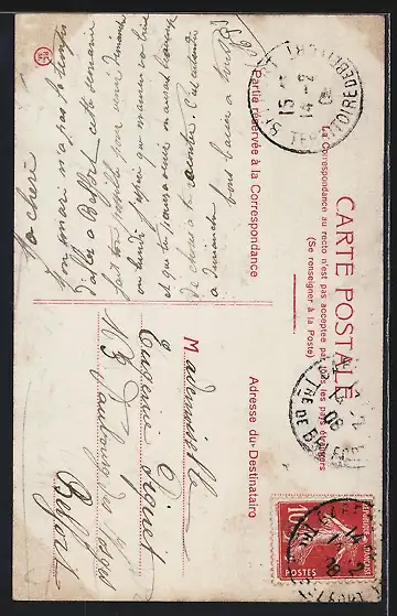Personenbezogene Daten auf der Rückseite der Karte wurden durch blauen Textmarker unkenntlich gemacht. Die blauen Stellen sind auf die Vorderseite durchgeweicht und wirken sich negativ auf das Postkartenfoto aus