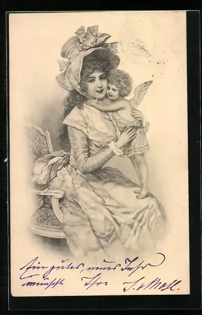 AK Hübsche junge Dame mit Hut hält einen Engel in den Armen