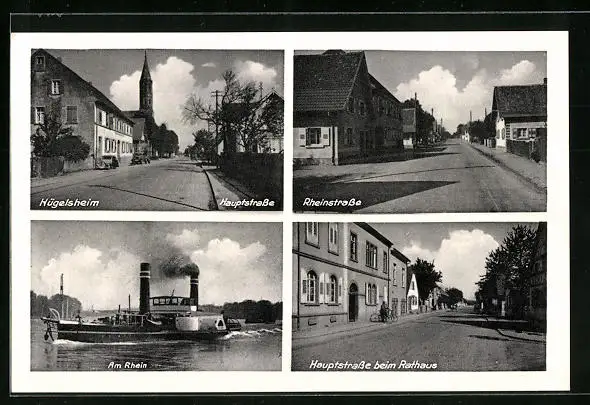 AK Hügelsheim, Rheindampfer, Hauptstrasse beim Rathaus