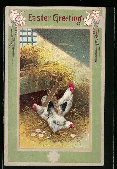 AK Hühner mit Ostereiern im Stall