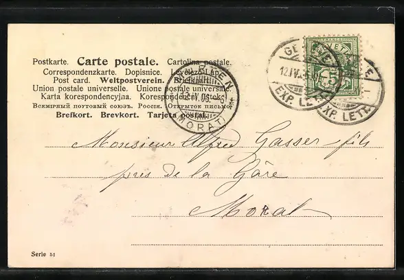 Personenbezogene Daten auf der Rückseite der Karte wurden durch blauen Textmarker unkenntlich gemacht. Die blauen Stellen sind auf die Vorderseite durchgeweicht und wirken sich negativ auf das Postkartenfoto aus