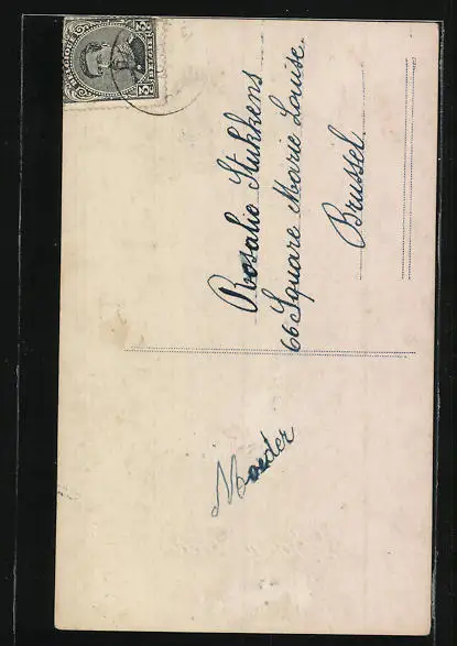 Personenbezogene Daten auf der Rückseite der Karte wurden durch blauen Textmarker unkenntlich gemacht. Die blauen Stellen sind auf die Vorderseite durchgeweicht und wirken sich negativ auf das Postkartenfoto aus