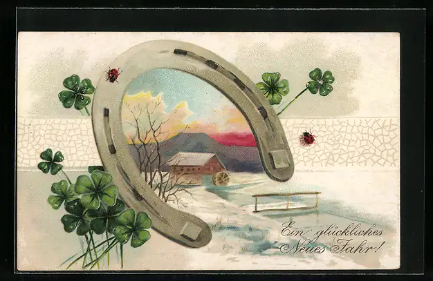 AK Hufeisen mit Kleeblättern und Winterlandschaft, Neujahrsgruss