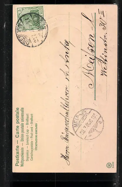 Personenbezogene Daten auf der Rückseite der Karte wurden durch blauen Textmarker unkenntlich gemacht. Die blauen Stellen sind auf die Vorderseite durchgeweicht und wirken sich negativ auf das Postkartenfoto aus