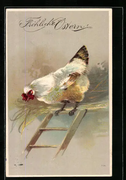 AK Huhn auf einer Leiter, Ostergruss