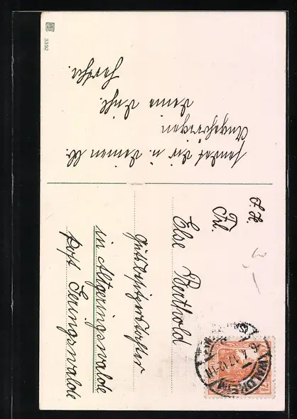 Personenbezogene Daten auf der Rückseite der Karte wurden durch blauen Textmarker unkenntlich gemacht. Die blauen Stellen sind auf die Vorderseite durchgeweicht und wirken sich negativ auf das Postkartenfoto aus