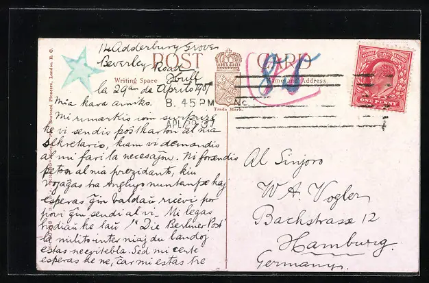 Personenbezogene Daten auf der Rückseite der Karte wurden durch blauen Textmarker unkenntlich gemacht. Die blauen Stellen sind auf die Vorderseite durchgeweicht und wirken sich negativ auf das Postkartenfoto aus