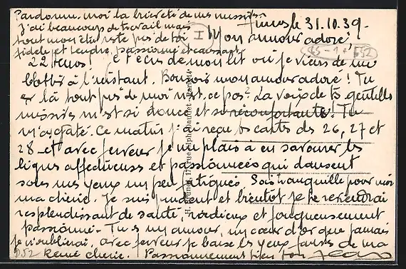 Personenbezogene Daten auf der Rückseite der Karte wurden durch blauen Textmarker unkenntlich gemacht. Die blauen Stellen sind auf die Vorderseite durchgeweicht und wirken sich negativ auf das Postkartenfoto aus