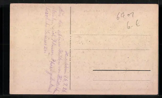 Personenbezogene Daten auf der Rückseite der Karte wurden durch blauen Textmarker unkenntlich gemacht. Die blauen Stellen sind auf die Vorderseite durchgeweicht und wirken sich negativ auf das Postkartenfoto aus