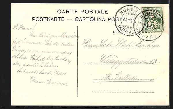 Personenbezogene Daten auf der Rückseite der Karte wurden durch blauen Textmarker unkenntlich gemacht. Die blauen Stellen sind auf die Vorderseite durchgeweicht und wirken sich negativ auf das Postkartenfoto aus